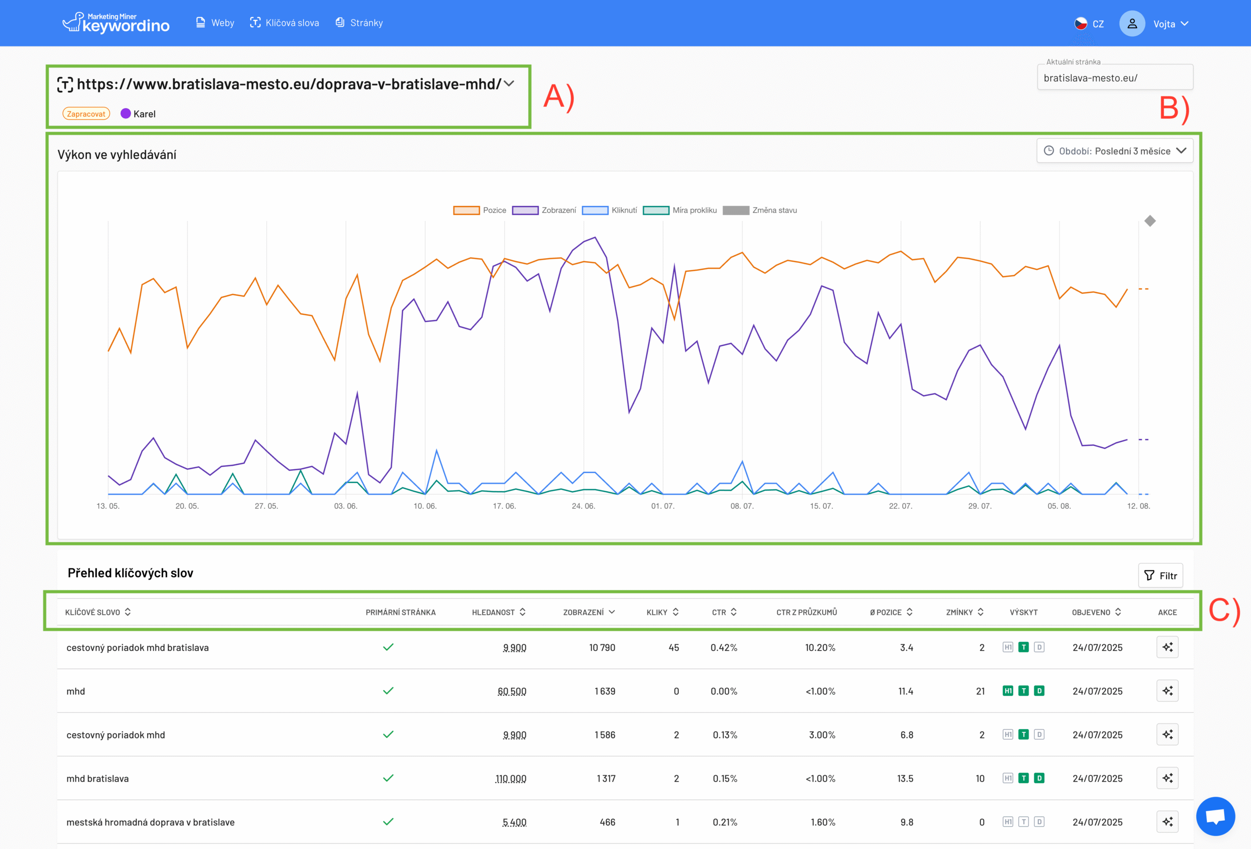 B) Graf výkonu stránky ve vyhledávání. Nahoře vpravo lze změnit období. Kromě standardních metrik je v tabulce také vidět, kdy uživatel v Keywordinu stránce změnil stav. Po najetí je vidět detail (z jakého na jaký stav, apod.).